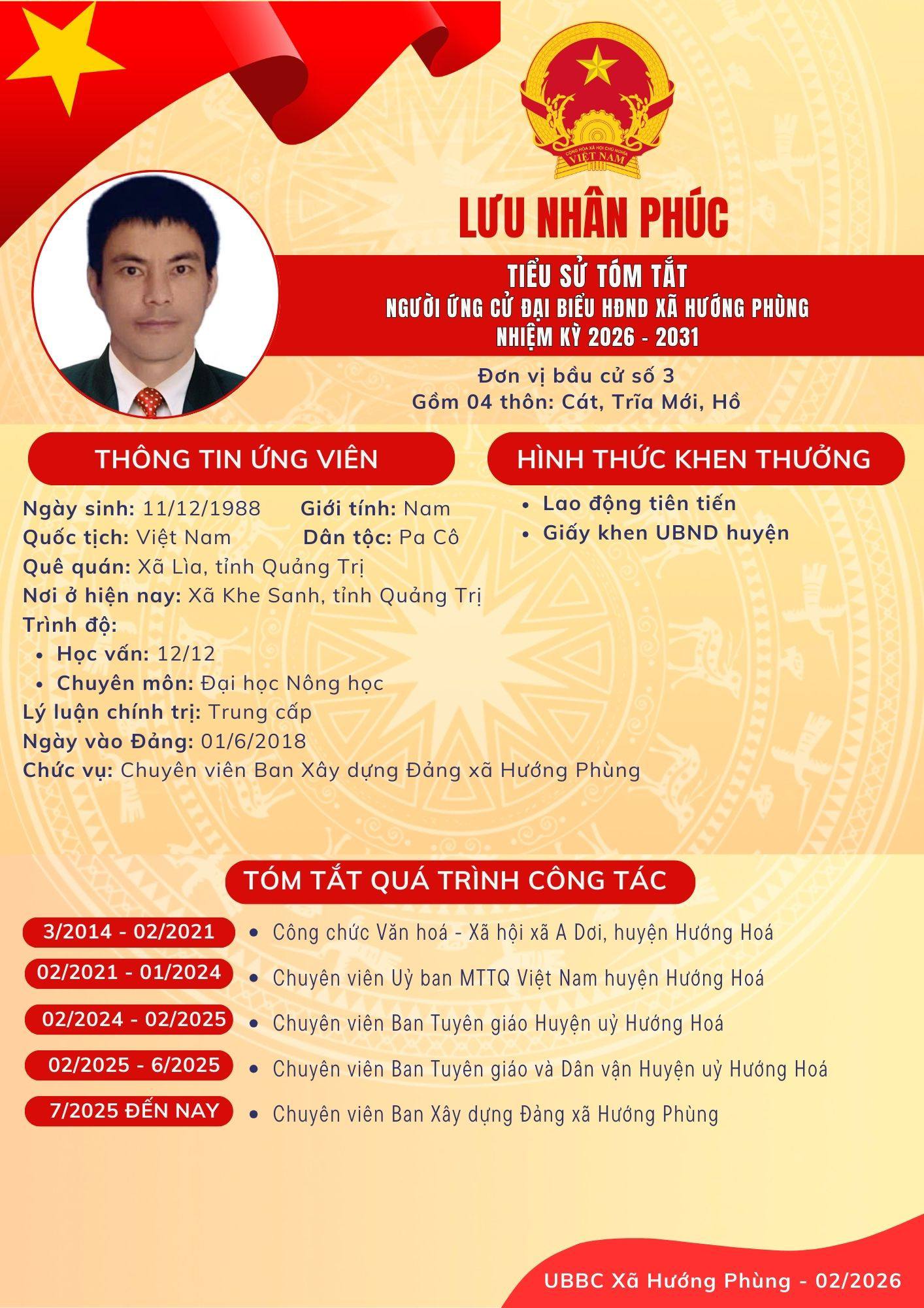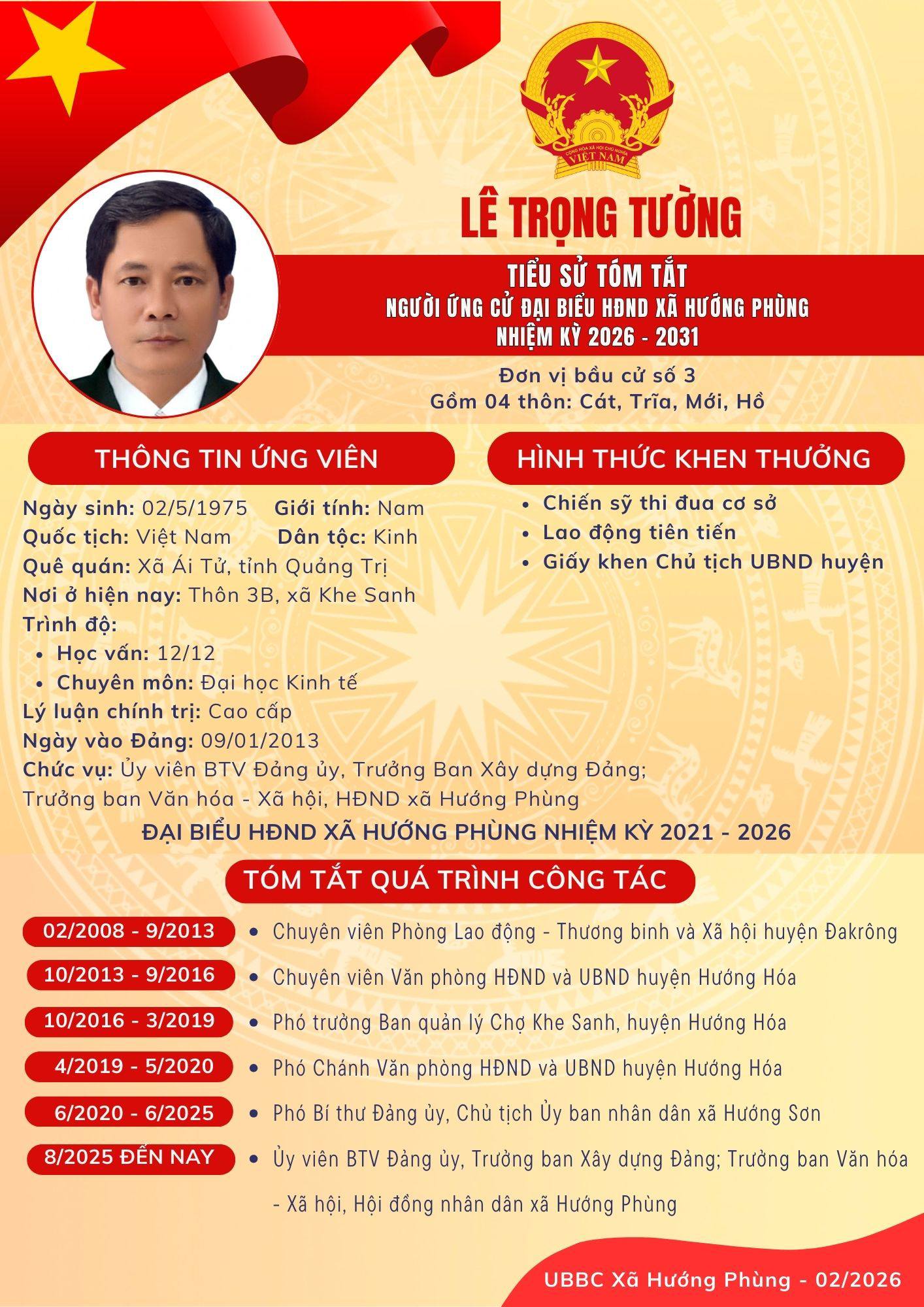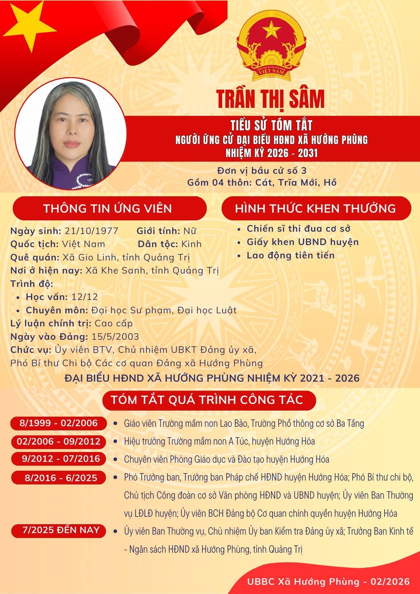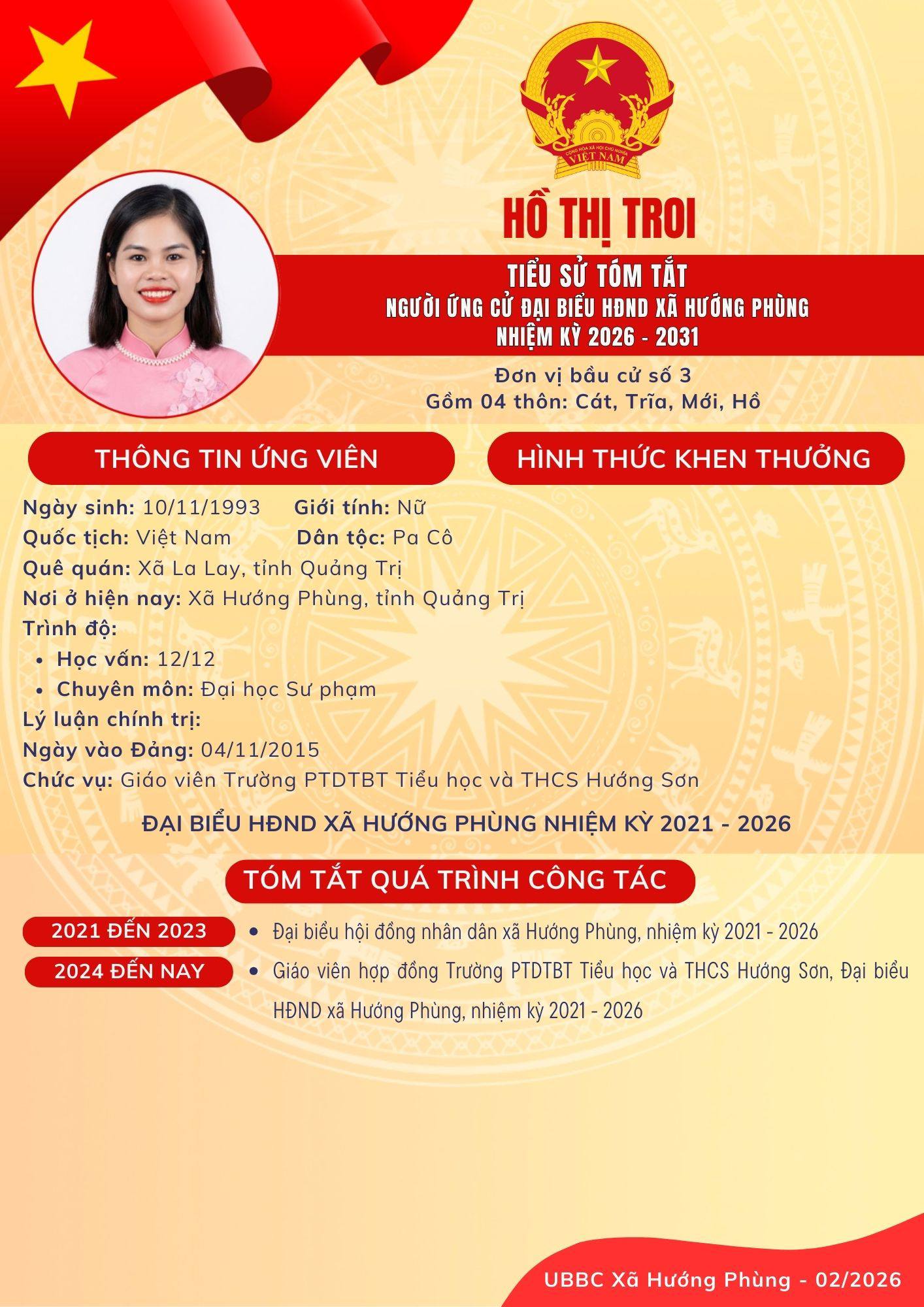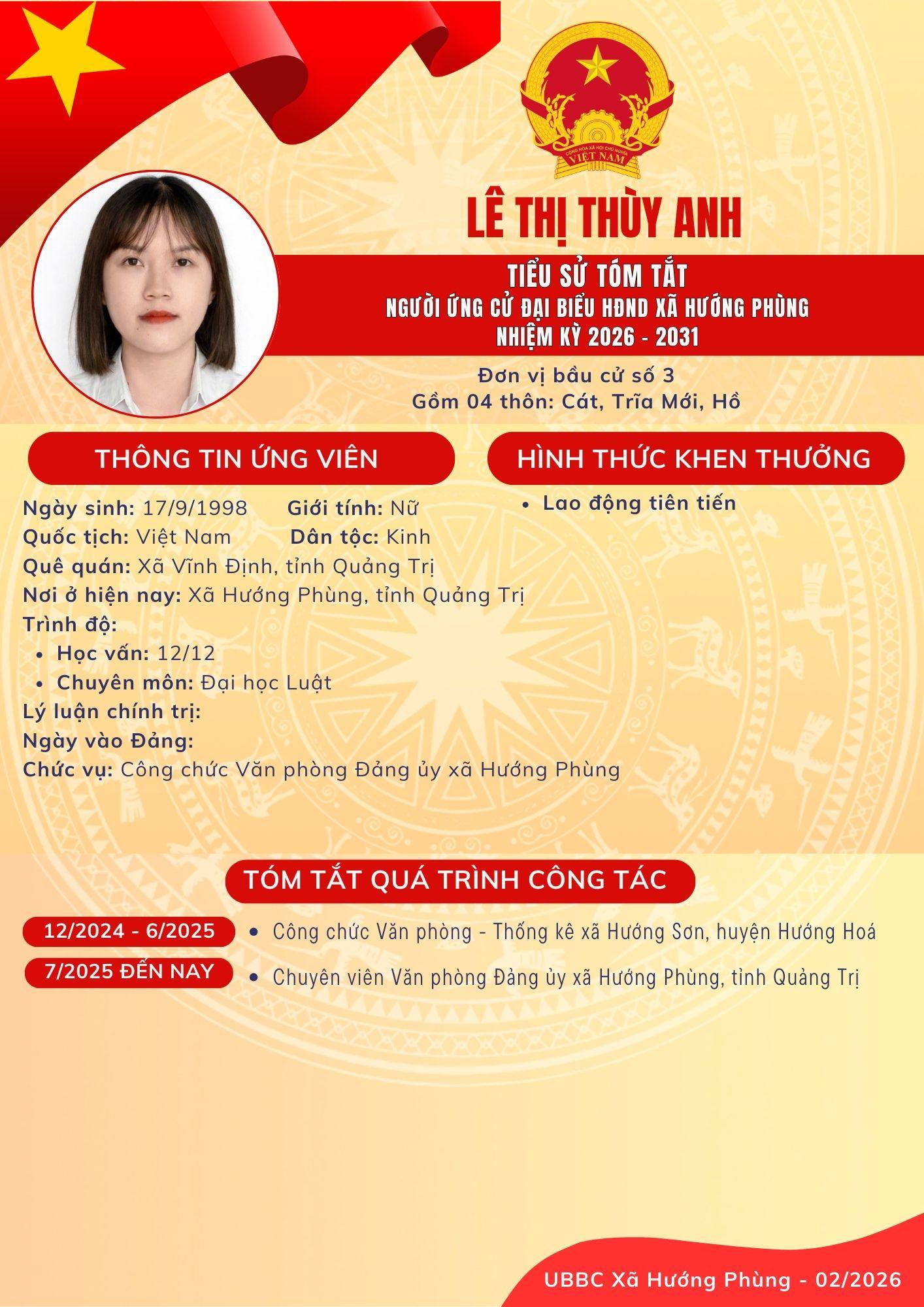 Danh sách chính thức ứng cử Đại biểu HĐND xã Hướng Phùng khoá XIII, nhiệm kỳ 2026 - 2031 - Đơn vị bầu cử số 3, gồm 04 thôn: Cát, Trĩa, Mới, Hồ.