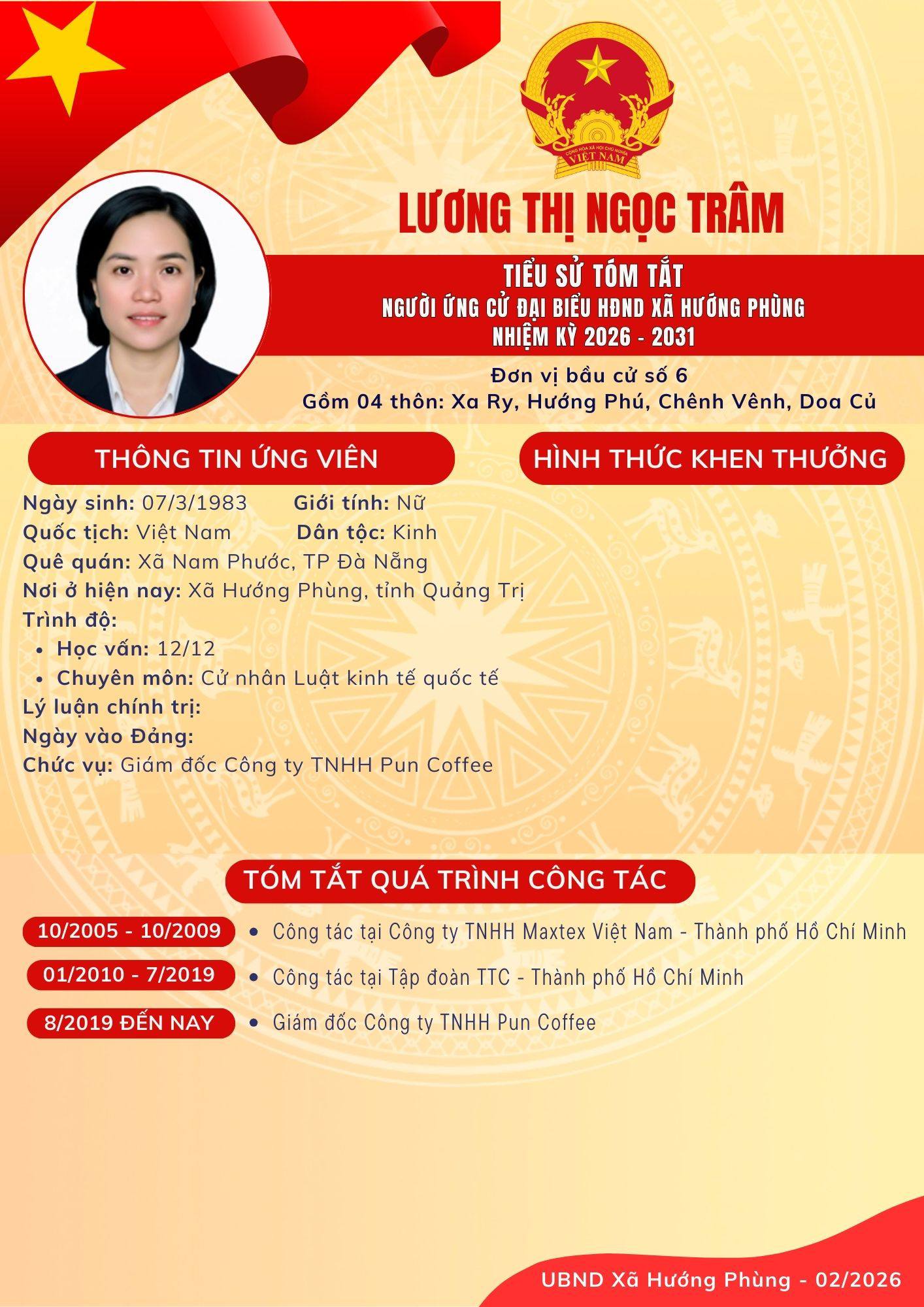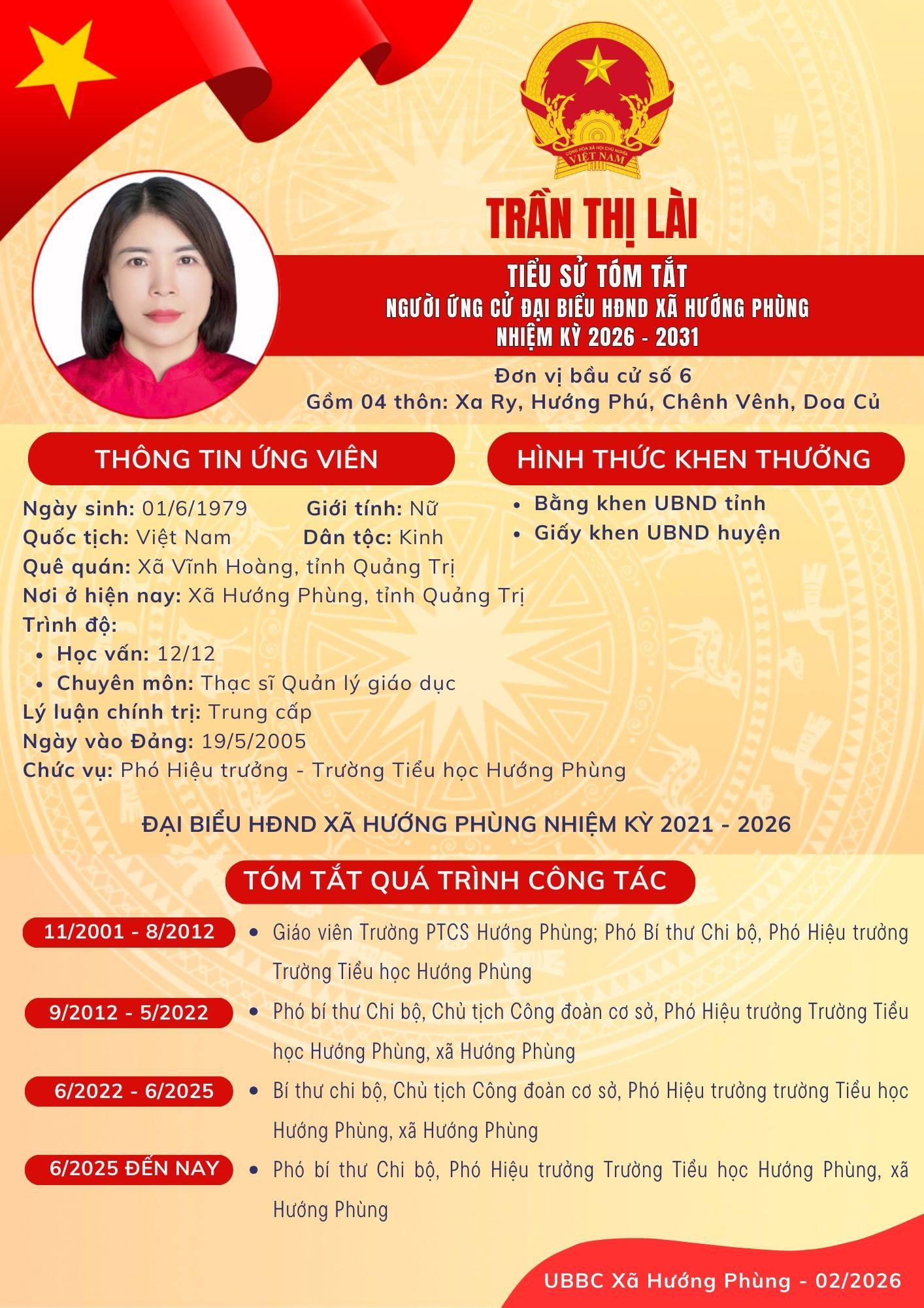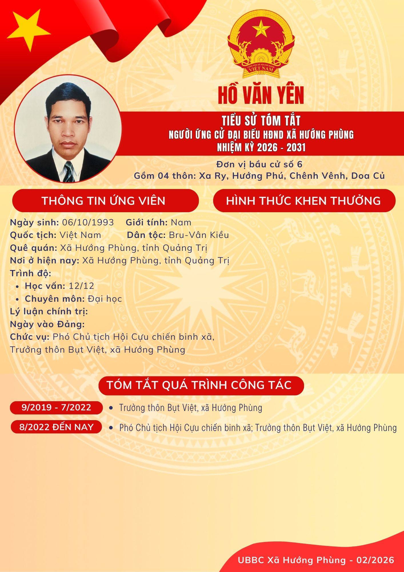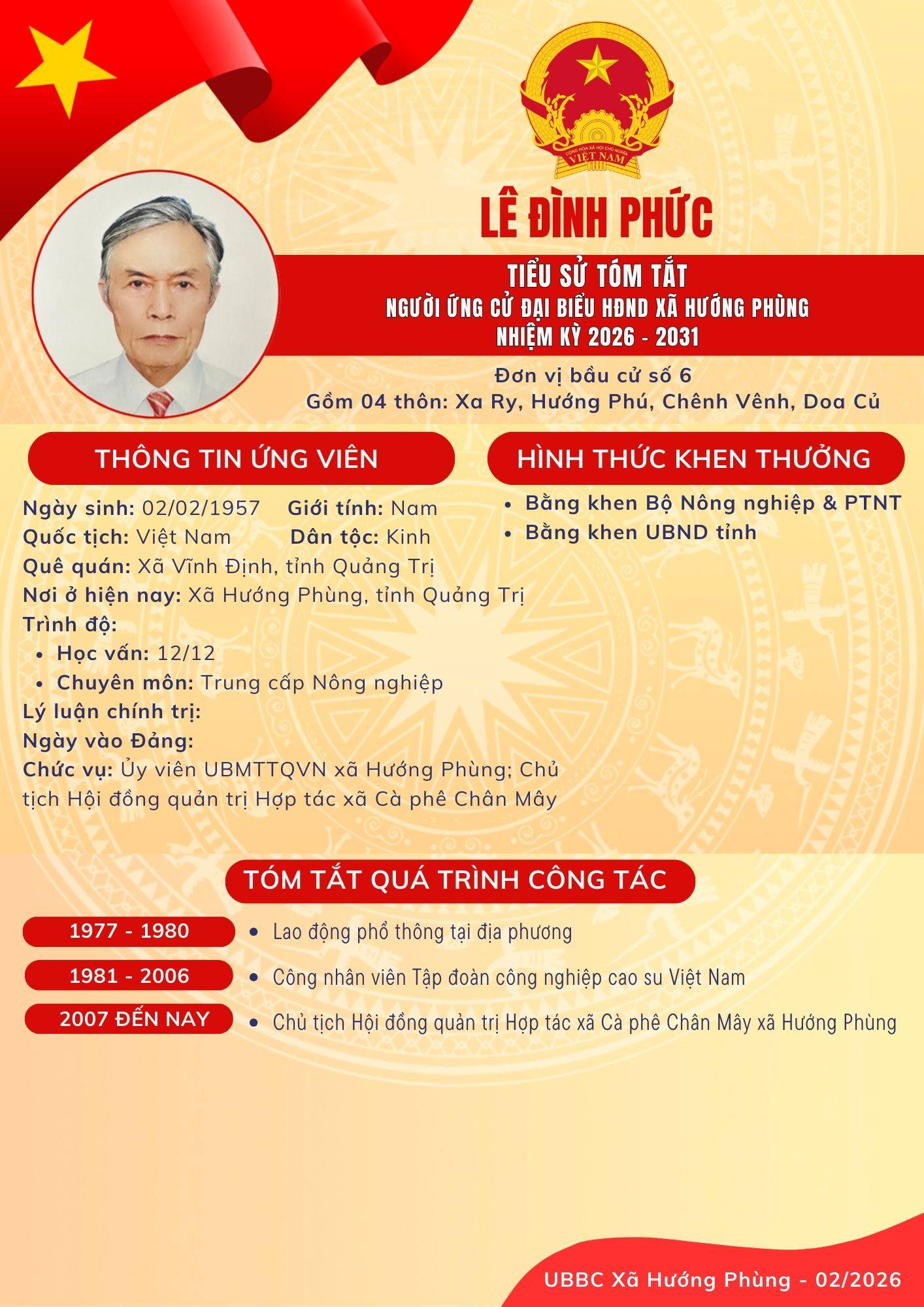 Danh sách chính thức ứng cử Đại biểu HĐND xã Hướng Phùng khoá XIII, nhiệm kỳ 2026 - 2031 - Đơn vị bầu cử số 6, gồm 04 thôn: Xa Ry, Hướng Phú, Chênh Vênh, Doa Củ:
