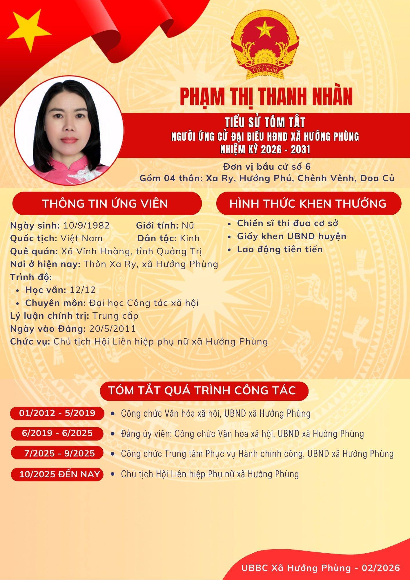 Danh sách chính thức ứng cử Đại biểu HĐND xã Hướng Phùng khoá XIII, nhiệm kỳ 2026 - 2031 - Đơn vị bầu cử số 6, gồm 04 thôn: Xa Ry, Hướng Phú, Chênh Vênh, Doa Củ