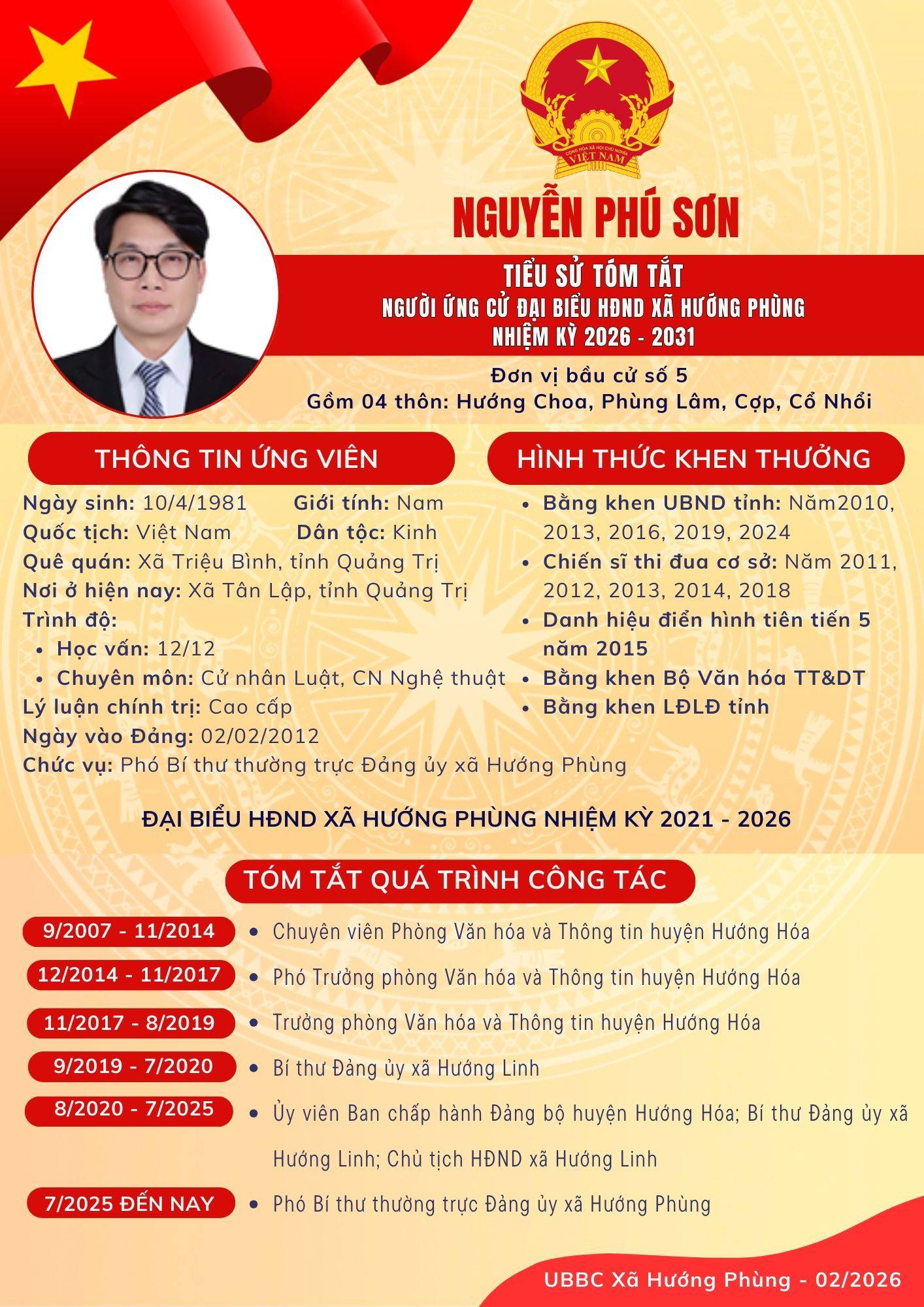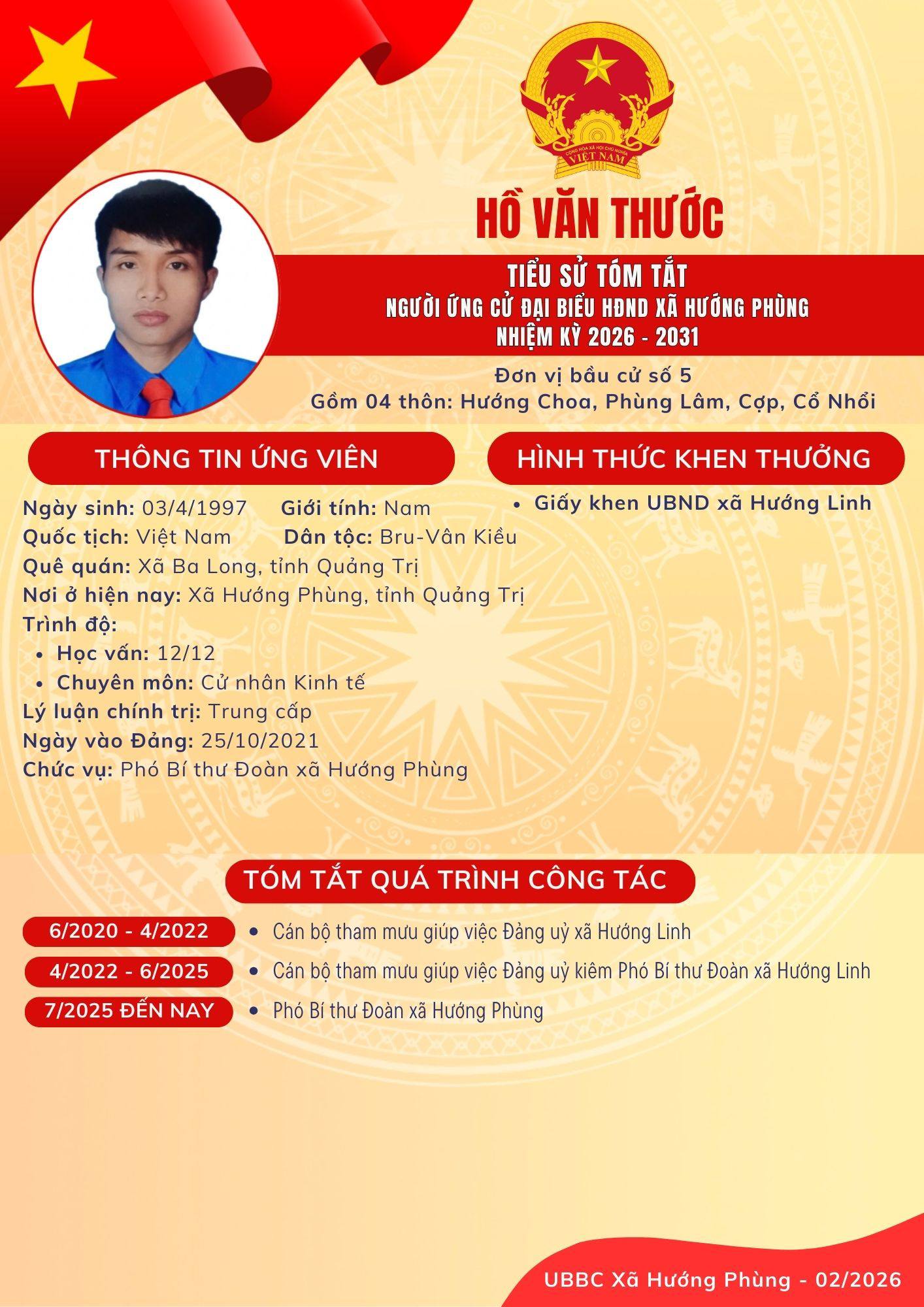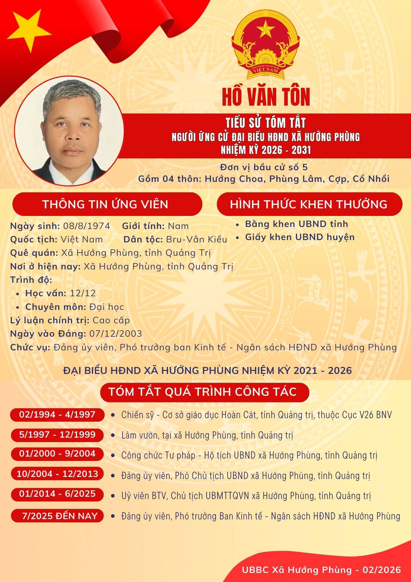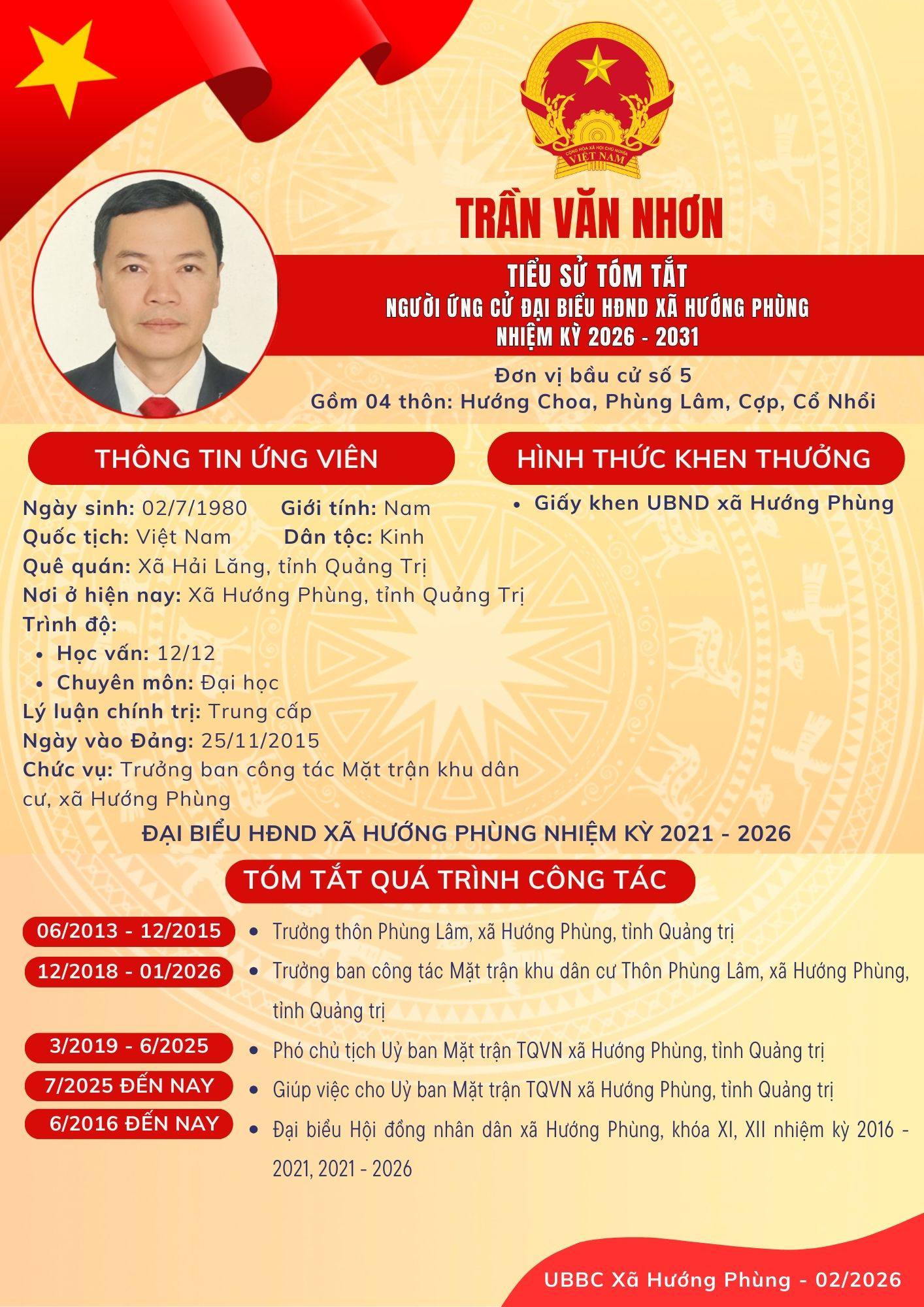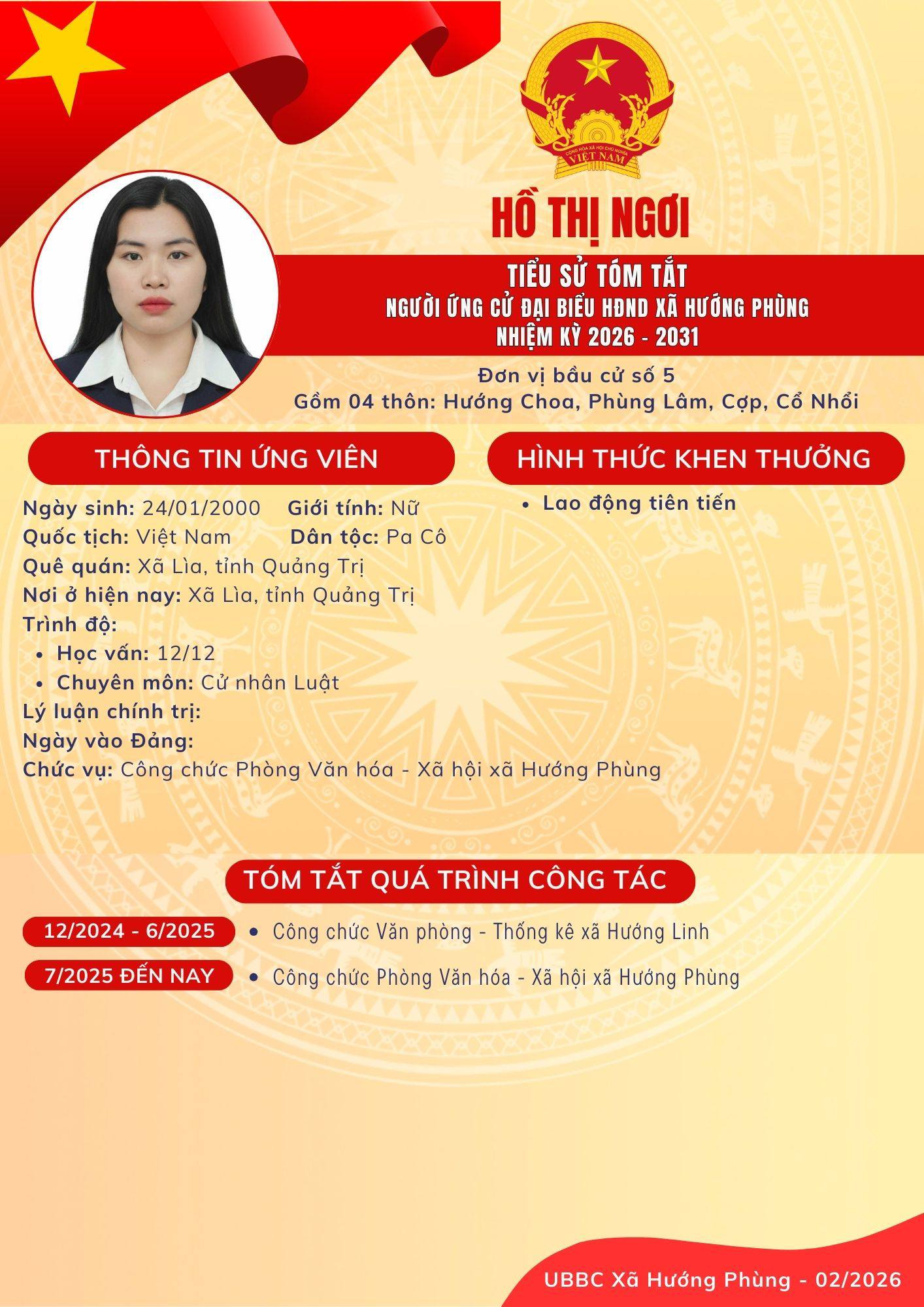 Danh sách chính thức ứng cử Đại biểu HĐND xã Hướng Phùng khoá XIII, nhiệm kỳ 2026 - 2031 - Đơn vị bầu cử số 5, gồm 04 thôn: Hướng Choa, Phùng Lâm, Cợp, Cổ Nhổi